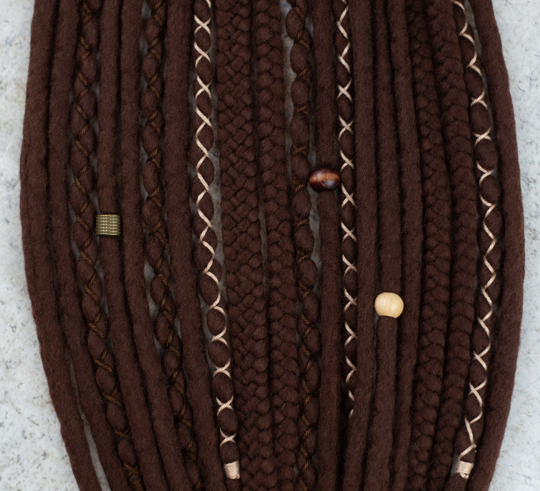 The mill dyed wool and yarn is toxic free, and complies with the OEKO-TEX 100 and GOTS requirements. We use high quality mulesing free extra fine merino wool for dreads. The dreadlocks are decorated with cotton yarn. We make the dreads with wet felting technique.