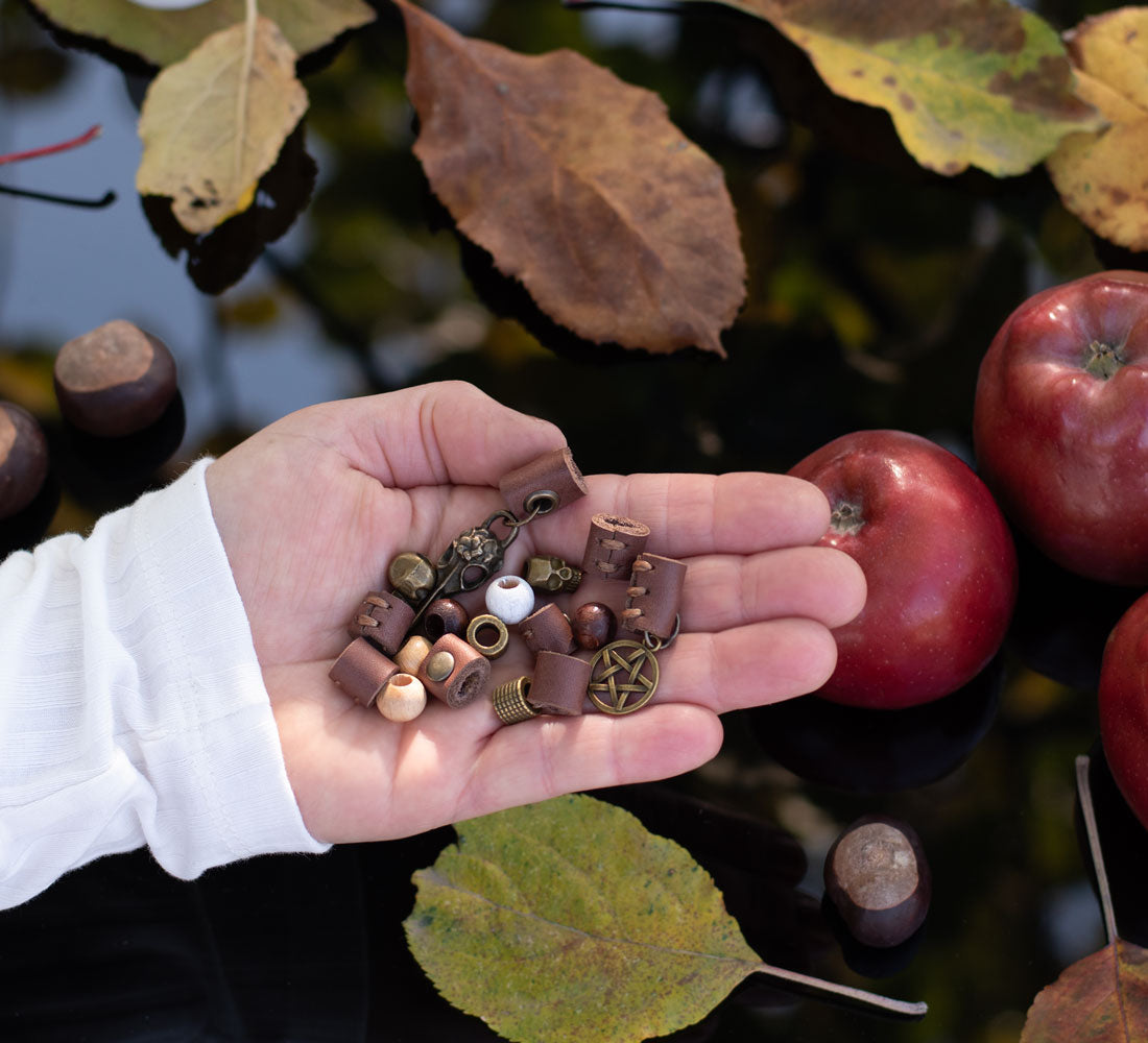 Add a touch of earthy elegance to your wool dreadlocks with the Viking collection's dreadlock bead set, featuring a handcrafted blend of leather with wood and metal accents. The genuine leather pieces are crafted by hand for an authentic artisanal feel, while the wood and metal beads add texture and depth to your look. This set perfectly complements the soft, natural look of merino wool dreadlocks. These beads are perfect for adding a unique touch to your style, representing the spirit of adventure, strength, and individuality.